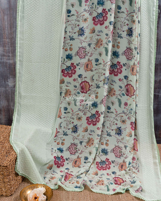 Light Weight Party Wear Georgette With Chikankari Embroidered Borders Mint Green Pastel Love Saree With Stitched Blouse In Size 38-44 | K765