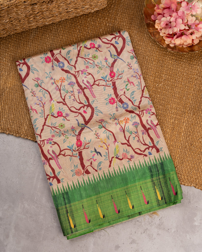 Beige Semi Tassar Silk Saree with Paithani Brocade Green Printed Borders & Green Pallu