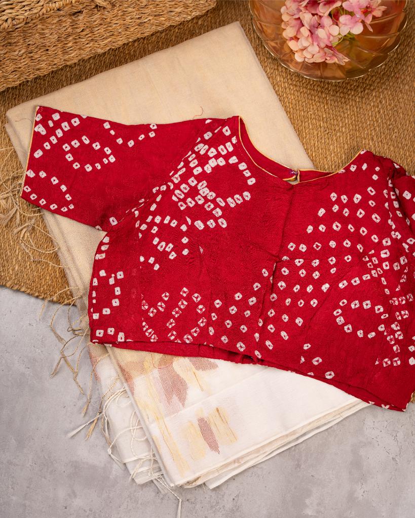 Red Bandini Patterned Blouse: Adds a vibrant and contrasting element, showcasing traditional tie-dye artistry.