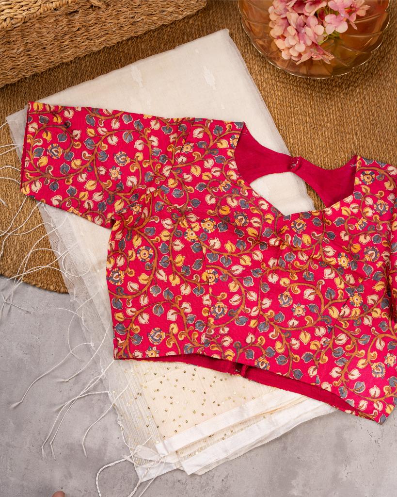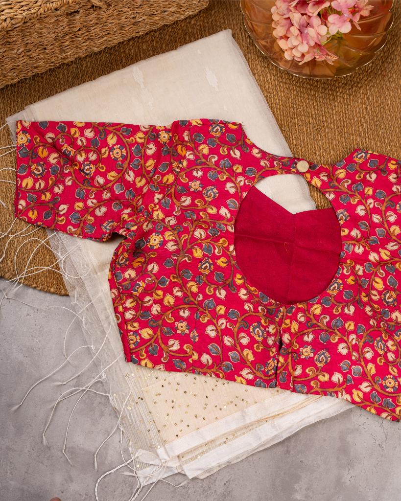 Red Kalamkari Print Pattern Blouse: Features traditional hand-painted or block-printed designs, providing a vibrant and artistic contrast.