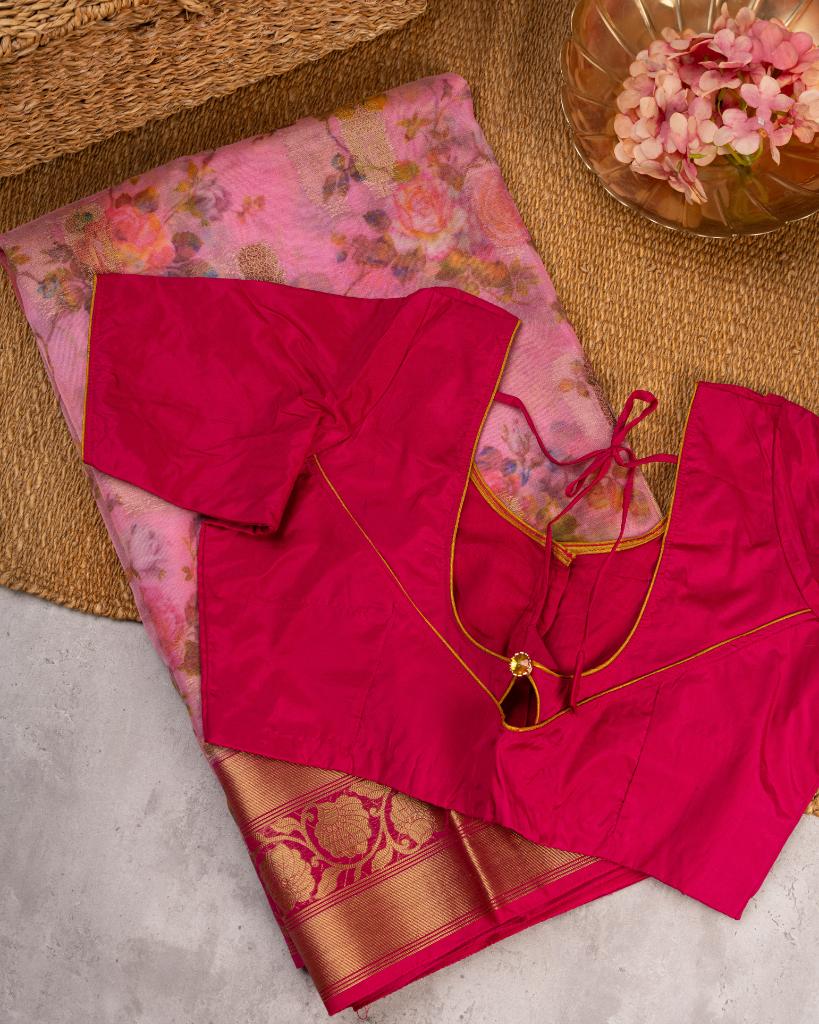 Floral Prints on Pastel Peach Banarasi Kora Silk Saree | Blouse Size 38-44” | Free Shipping