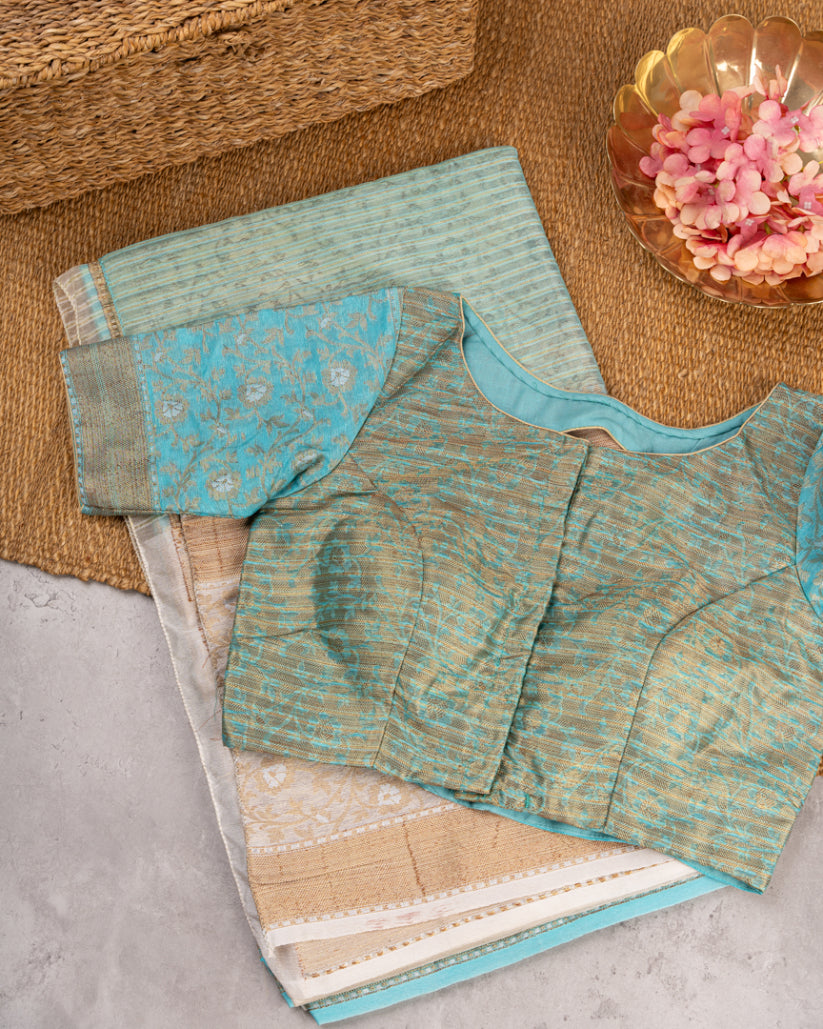Pastel blue Banarasi Kora Silk Saree with beige meenakari borders & beige Pattern Blouse | Blouse size 38-44" | Free Shipping