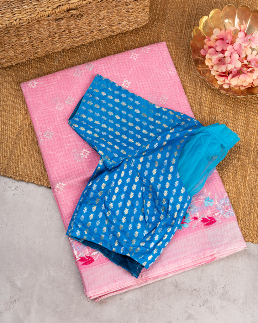 Pastel Pink Kota Silk Saree with Chikankari & Machine Embroidery, Silver Borders & Blue Banarasi Brocade Blouse