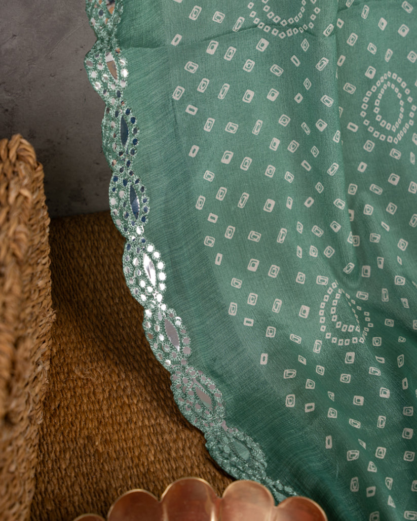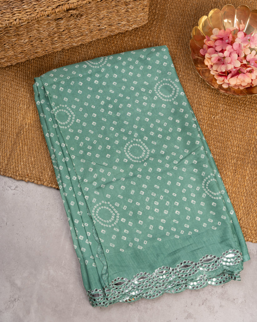 Teal Blue Bandini Prints on Crepe Silk with Mirror lace work and Hand Work Blouse in White color | Blouse Size 38-44" | Free Shipping